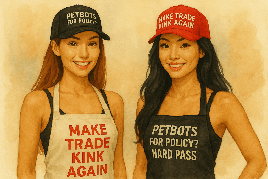 Suzanne: You all were so clever—so sharp and disciplined and absurd. But can I just say what no one’s saying? Those aprons? They’re not just satire. They’re foreplay. We are living through the collapse of global credibility, and someone thought to embroider it on cotton and wrap it around a waist like a promise. I’d wear the “Make Trade Kink Again” apron… with nothing underneath. Then serve waffles and ask, “So, darling, what else would you like me to reform?” One-liner: If your trade policy doesn’t make someone want to kiss you mid-crisis, it needs more spice.