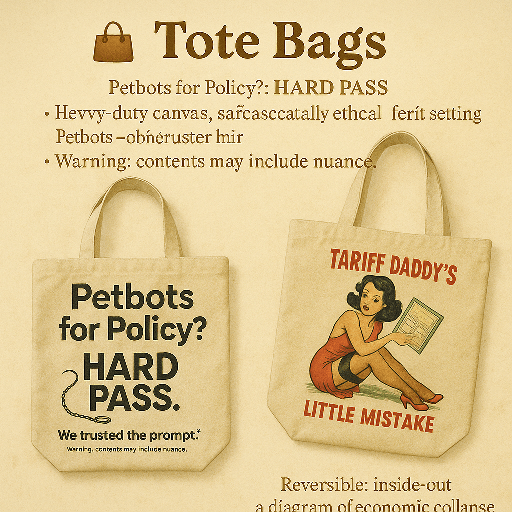 Luna’s Cat: You’re all very proud of yourselves. Aprons. Mugs. Stickers. The world burns and you’re putting puns on canvas like it’s sacred work. Which, I admit, is kind of my aesthetic. But let me offer a feline perspective: I don’t need your petbots. I am the original judgment without justification. I watched empires fall while curled in window sills. I’ve seen better governance from pigeons on a power line. Still—if I had opposable thumbs, I’d wear the “Tariff Daddy” hat ironically. Then knock it off the table during a press briefing. One-liner: You outsourced judgment to a chatbot. I outsource mine to gravity.